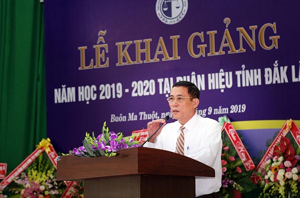 Phát biểu tại buổi lễ, TS. Trần Quang Huy, Phó Hiệu trưởng phụ trách Trường Đại học Luật Hà Nội nhiệt liệt chúc mừng các tân sinh viên đã trúng tuyển vào Trường, đồng thời khẳng định tập thể Trường Đại học Luật Hà Nội nói chung và Phân hiệu Trường Đại học Luật Hà Nội tại tỉnh Đắk Lắk nói riêng, cùng các sinh viên sẽ quyết tâm, nỗ lực hơn nữa trong học tập và giảng dạy để nâng cao chất lượng giáo dục nhằm mục tiêu phát triển mạnh nguồn nhân lực, nhất là nguồn nhân lực pháp luật chất lượng cao. Phó Hiệu trưởng phụ trách Trường Đại học Luật Hà Nội cũng mong muốn tiếp tục nhận được sự quan tâm, tạo điều kiện của Lãnh đạo địa phương trong thời gian tới.