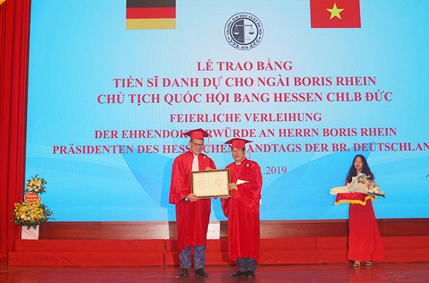 Ngày 13/11, TS.Trần Quang Huy, Phó Hiệu trưởng phụ trách Trường ĐH Luật Hà Nội đã trao tặng bằng Tiến sĩ danh dự của Trường ĐH Luật Hà Nội cho ông Boris Rhein, Chủ tịch Quốc hội Bang Hessen, Cộng hòa Liên bang Đức nhằm ghi nhận những đóng góp của Ông đối với sự nghiệp giáo dục, khoa học, hợp tác quốc tế và chính trị của Việt Nam. Thứ trưởng Bộ Tư pháp Đặng Hoàng Oanh, đại diện một số đơn vị trong và ngoài Bộ cùng tham dự buổi lễ.