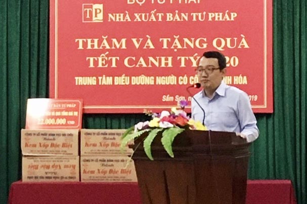 Hướng tới kỷ niệm 75 năm Ngày thành lập Quân đội Nhân dân Việt Nam (22/12/1944 - 22/12/2019) và chuẩn bị bước sang Năm mới 2020, nhằm động viên tinh thần, hỗ trợ phần nào điều kiện về vật chất để chăm sóc tốt hơn đối với thương binh, bệnh binh, người có công với cách mạng, chiều tối ngày 13/12/2019, Nhà xuất bản Tư pháp đã phối hợp với Sở Tư pháp tỉnh Thanh Hóa thăm, tặng quà Trung tâm Điều dưỡng người có công tỉnh Thanh Hóa. Tham dự hoạt động có đồng chí Hồ Quang Huy, Bí thư Chi bộ, Giám đốc Nhà xuất bản Tư pháp, đồng chí Nguyễn Ngọc Minh, Phó Giám đốc Sở Tư pháp tỉnh Thanh Hóa, đồng chí Trịnh Xuân Tùng, Phó Bí thư chuyên trách Đoàn Bộ, đại diện các tổ chức đoàn thể, đơn vị liên quan thuộc Nhà xuất bản Tư pháp, Sở Tư pháp tỉnh Thanh Hóa.