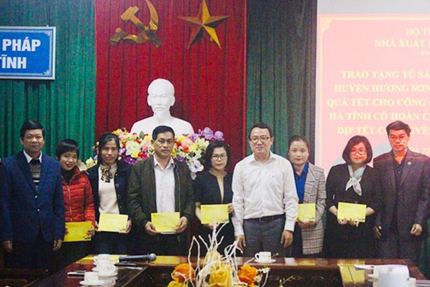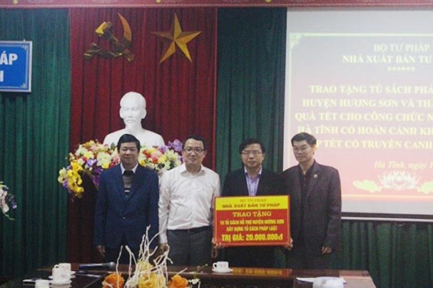 Tiếp đó, thứ bảy ngày 14/12/2019, Nhà xuất bản Tư pháp đã phối hợp với Sở Tư pháp tỉnh Hà Tĩnh tổ chức trao tặng 10 Tủ sách pháp luật cho Phòng Tư pháp huyện Hương Sơn, tỉnh Hà Tĩnh và trao 10 suất quà từ nguồn kinh phí xã hội hóa cho cán bộ, công chức tư pháp tại địa phương có hoàn cảnh khó khăn nhân dịp Tết Canh Tý 2020. Về phía Sở Tư pháp có các đồng chí Phó Giám đốc Sở Nguyễn Thanh Hải, Nguyễn Văn Cường, đại diện Lãnh đạo Công đoàn, Đoàn thanh niên, các Phòng liên quan thuộc Sở và Trưởng phòng Tư pháp huyện Hương Sơn.
