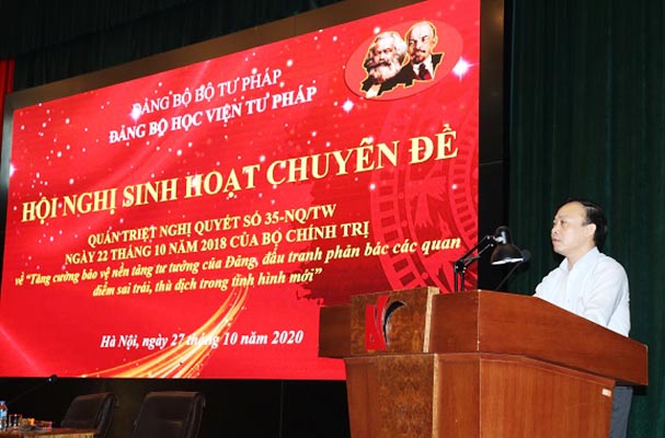 Sáng 28/10, Đảng bộ Học viện Tư pháp đã tổ chức Hội nghị sinh hoạt chuyên đề với chủ đề quán triệt Nghị quyết số 35-NQ/TW ngày 22/10/2018 của Bộ Chính trị khóa XII về “Tăng cường bảo vệ nền tảng tư tưởng của Đảng, đấu tranh phản bác các quan điểm sai trái, thù địch trong tình hình mới” cho công chức, viên chức, người lao động của Học viện Tư pháp. Đảng ủy Học viện Tư pháp cũng mời đảng viên Chi bộ Tạp chí dân chủ Pháp luật và Trung tâm Lý lịch tư pháp quốc gia; học viên Lớp đào tạo nghiệp vụ thi hành án khóa 20 tại Hà Nội, thành phố Hồ Chí Minh cùng tham dự Hội nghị.