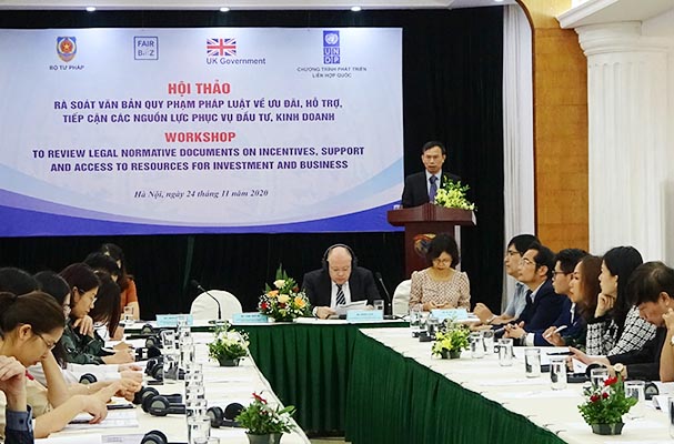 Ngày 24/11, Cục Kiểm tra văn bản quy phạm pháp luật (VBQPPL) - Bộ Tư pháp phối hợp với Chương trình Phát triển của Liên Hợp quốc – UNDP tại Việt Nam và Đại sứ quán Anh tại Hà Nội tổ chức “Hội thảo rà soát, hoàn thiện pháp luật về ưu đãi, hỗ trợ, tiếp cận các nguồn lực phục vụ đầu tư, kinh doanh”. Hội thảo nhằm tổng hợp các khuyến nghị pháp lý để đề xuất hoàn thiện pháp luật, tạo môi trường kinh doanh công bằng, minh bạch tại Việt Nam.