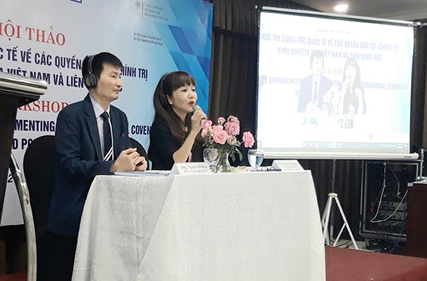 Thực hiện “Chương trình hợp tác ba năm trong khuôn khổ Chương trình hợp tác Đối thoại Nhà nước pháp quyền giai đoạn từ 2019 đến tháng 4/2022” được ký kết giữa Bộ Tư pháp Cộng hòa xã hội chủ nghĩa Việt Nam với Bộ Tư pháp và Bảo vệ người tiêu dùng Liên bang Cộng hòa Liên bang Đức, trong 02 buổi chiều ngày 02 – 03/12/2020, Bộ Tư pháp đã tổ chức Hội thảo “Thực thi Công ước quốc tế về các quyền dân sự, chính trị - Kinh nghiệm của Cộng hòa xã hội chủ nghĩa Việt Nam và Cộng hòa Liên bang Đức” do đồng chí Nguyễn Đỗ Kiên, Phó Vụ trưởng Vụ Tổ chức cán bộ, đồng chí Nguyễn Linh Kha, Phó Vụ trưởng Vụ Pháp luật quốc tế và đồng chí Vũ Thị Lan Anh, Phó Hiệu trưởng Trường Đại học Luật đồng chủ trì.