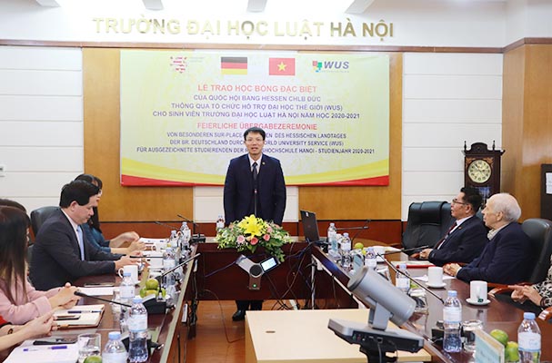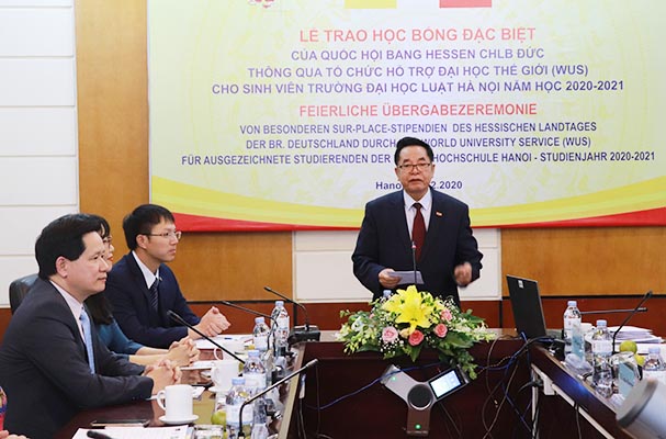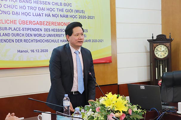 Nhân dịp này, Vụ trưởng Vụ Hợp tác quốc tế Nguyễn Hữu Huyên đã điểm lại một số kết quả hợp tác nổi bật giữa Bộ Tư pháp 2 nước nói chung và giữa Bộ Tư pháp Việt Nam với bang Hessen nói riêng đồng thời gửi lời cảm ơn tới đối tác Đức khi đã tích cực triển khai nhiều hoạt động hiệu quả trong thời gian qua. Ông hy vọng các em sinh viên được nhận học bổng sẽ tiếp tục nỗ lực, phấn đấu để đạt kết quả học tập tốt hơn nữa và Trường ĐH Luật Hà Nội sẽ có thêm nhiều sinh viên có thành tích xuất sắc để đạt được các suất học bổng giá trị của CHLB Đức, có cơ hội được du học tại Đức.