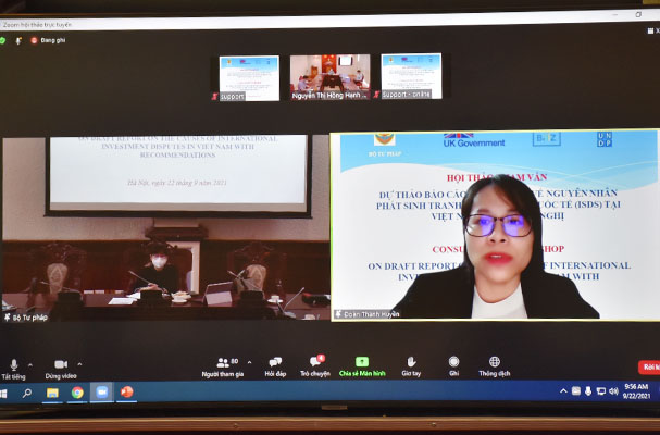 Sáng nay (22/9), Bộ Tư pháp đã tổ chức Hội thảo tham vấn trực tuyến “Dự thảo Báo cáo chuyên gia về nguyên nhân phát sinh tranh chấp đầu tư quốc tế (ISDS) tại Việt Nam và khuyến nghị”. Ông Bạch Quốc An, Vụ trưởng Vụ pháp luật quốc tế và bà Lại Thị Vân Anh, Phó Vụ trưởng Vụ pháp luật quốc tế đồng chủ trì Hội thảo điểm cầu tại Bộ Tư pháp. Tham dự Hội thảo về phía UNDP có bà Diana Torres, Trợ lý Đại diện thường trú, Trưởng phòng Quản trị và Tham gia UNDP Việt Nam; bà Đỗ Thúy Vân, cán bộ dự án, UNDP Việt Nam; TS. Markus Burgstaller, Luật sư thành viên, Hogan Lovells, London. Ngoài ra, còn có đại diện một số Bộ, ngành; các trường đại học; các luật sư của một số công ty luật và hiệp hội doanh nghiệp nước ngoài tại Việt Nam.