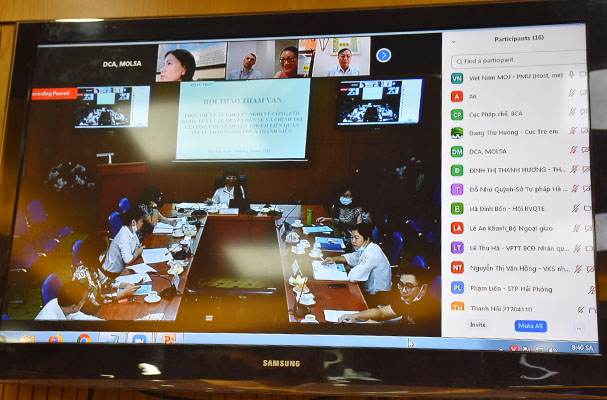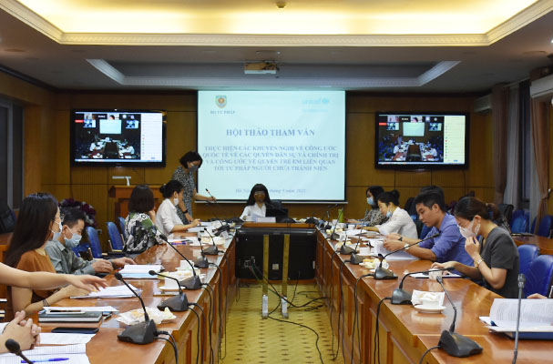 Sáng ngày 30/9/2021, Phó Vụ trưởng Vụ Pháp luật quốc tế, Bộ Tư pháp Nguyễn Linh Kha đã chủ trì Hội thảo tham vấn trực tuyến “Thực hiện các khuyến nghị về Công ước quốc tế vè các quyền dân sự và chính trị và Công ước về quyền trẻ em liên quan tới tư pháp người chưa thành niên” tại điểm cầu Bộ Tư pháp. Tham dự Hội nghị còn có ông Sergiu Rusanovschi, Chuyên gia về Bảo vệ trẻ em của UNICEF.
