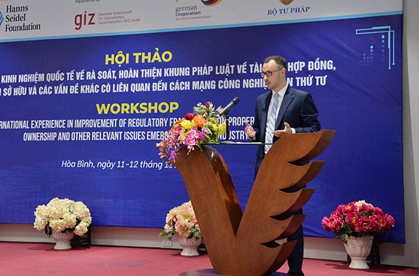 Ngày 11 – 12/11/2021, Bộ Tư pháp (được sự hỗ trợ của Tổ chức Hanns Seidel Foundation (HSF) và Tổ chức hợp tác quốc tế Đức (GIZ) đã tổ chức Hội thảo “Chia sẻ kinh nghiệm quốc tế về rà soát, hoàn thiện khung pháp luật về tài sản, hợp đồng, quyền sở hữu và các vấn đề có liên quan đến Cách mạng công nghiệp lần thứ tư”. Hội thảo do bà Nguyễn Chi Lan, Phó Vụ trưởng Vụ Pháp luật dân sự - kinh tế, Bộ Tư pháp; ông Michael Siegner, Trưởng đại diện tổ chức HSF tại Việt Nam và ông Tarek Hassan, Giám đốc Trung tâm Chuyển đổi số GIZ chủ trì.