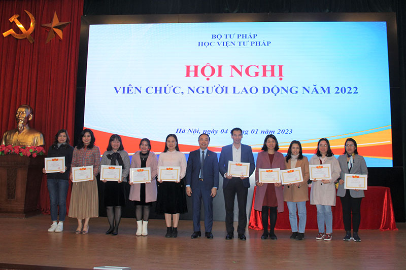 Tại Hội nghị, Giám đốc Học viện Tư pháp Nguyễn Xuân Thu trao tặng danh hiệu “Chiến sĩ thi đua cơ sở” và Giấy khen cho các cá nhân và tập thể đạt thành tích xuất sắc trong công tác năm 2022. Đồng chí Vũ Thị Hòa - Chủ tịch Công đoàn, Trưởng Khoa Đào tạo Luật sư trao Giấy khen của Công đoàn Học viện Tư pháp cho các cá nhân và tập thể đạt thành tích trong công tác Công đoàn năm 2022.