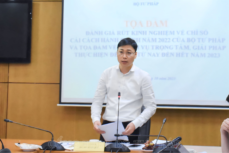 Báo cáo tại Tọa đàm, đại diện Văn phòng Bộ cho biết, tổng số điểm Chỉ số cải cách hành chính (CCHC) của Bộ Tư pháp năm 2022 là 90.63/100 điểm – xếp thứ 2/17 Bộ. Đây là năm thứ năm liên tiếp Bộ Tư pháp duy trì nhóm 3 Bộ dẫn đầu về Chỉ số CCHC cấp Bộ; đặc biệt, công tác chỉ đạo, điều hành CCHC tiếp tục là lĩnh vực được đánh giá cao của Bộ Tư pháp. Bên cạnh đó, lĩnh vực Cải cách thể chế, Cải cách thủ tục hành chính, Cải cách tổ chức bộ máy hành chính của Bộ Tư pháp cũng được xếp hạng thuộc nhóm 03 bộ dẫn đầu, trong đó lĩnh vực cải cách thể chế của bộ và cải cách tổ chức bộ máy hành chính đều xếp thứ 1/17 bộ.