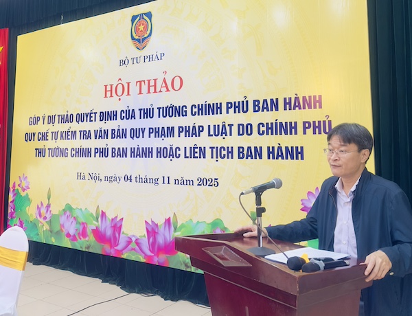 Ngày 04/11/2025, Cục Kiểm tra văn bản và Quản lý xử lý vi phạm hành chính (Cục KTVB&QLXLVPHC), Bộ Tư pháp tổ chức Hội thảo “Góp ý dự thảo Quyết định của Thủ tướng Chính phủ ban hành Quy chế tự kiểm tra văn bản quy phạm pháp luật do Chính phủ, Thủ tướng Chính phủ ban hành hoặc liên tịch ban hành”.