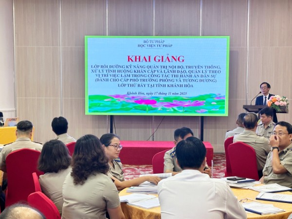 Thực hiện Kế hoạch tuyển sinh bồi dưỡng năm 2025 của Học viện Tư pháp và Quyết định số 1990/QĐ-HVTP ngày 22/9/2025 của Giám đốc Học viện Tư pháp về việc mở các lớp bồi dưỡng kỹ năng quản trị nội bộ, truyền thông, xử lý tình huống khẩn cấp và lãnh đạo, quản lý theo vị trí việc làm trong công tác thi hành án dân sự (dành cho cấp Phó Trưởng phòng và tương đương), sáng 17/11/2025, tại Nha Trang, tỉnh Khánh Hòa, Học viện Tư pháp đã long trọng tổ chức khai giảng Lớp thứ bảy.