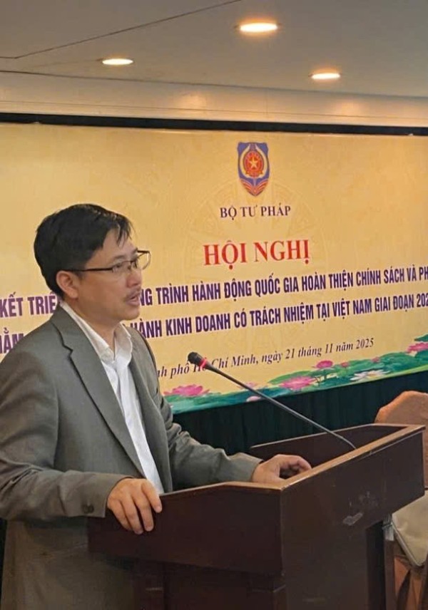 Ngày 14/7/2023, Thủ tướng Chính phủ đã phê duyệt Quyết định số 843/QĐ-TTg ban hành Chương trình hành động quốc gia hoàn thiện chính sách và pháp luật nhằm thúc đẩy thực hành kinh doanh có trách nhiệm tại Việt Nam giai đoạn 2023-2027 (Chương trình hành động quốc gia). Bộ Tư pháp được giao chủ trì, phối hợp với các Bộ, cơ quan ngang bộ, địa phương, tổ chức có liên quan tổ chức thực hiện Chương trình hành động quốc gia và trong đó có nhiệm vụ sơ kết, đánh giá việc triển khai Chương trình này. Thực hiện nhiệm vụ được Lãnh đạo Bộ Tư pháp giao, Vụ Pháp luật dân sự - kinh tế (Bộ Tư pháp) vừa tổ chức Hội nghị sơ kết việc triển khai Chương trình hành động quốc gia hoàn thiện chính sách và pháp luật nhằm thúc đẩy thực hành kinh doanh có trách nhiệm tại Việt Nam giai đoạn 2023-2025 tại thành phố Hồ Chí Minh.