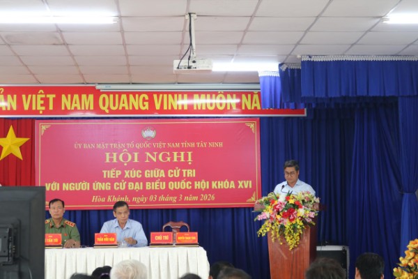 Sáng 3/3, Ủy ban Mặt trận Tổ quốc (MTTQ) Việt Nam tỉnh Tây Ninh tổ chức Hội nghị tiếp xúc giữa cử tri với những người ứng cử đại biểu Quốc hội khóa XVI thuộc đơn vị bầu cử số 1 tại xã Hòa Khánh. Hội nghị do ông Nguyễn Thanh Tùng, Phó Chủ tịch Ủy ban MTTQ Việt Nam tỉnh chủ trì, với sự tham dự trực tiếp và trực tuyến của lãnh đạo địa phương cùng hơn 350 cử tri các xã Hòa Khánh và Đức Hòa.