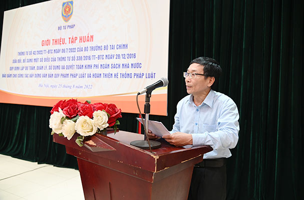 Ngày 25/8, Bộ Tư pháp đã tổ chức buổi giới thiệu, tập huấn Thông tư số 42/2022/TT-BTC ngày 6/7/2022 của Bộ trưởng Bộ Tài chính sửa đổi, bổ sung một số điều của Thông tư số 338/2016/TT-BTC ngày 28/12/2016 quy định lập dự toán, quản lý, sử dụng và quyết toán kinh phí ngân sách nhà nước bảo đảm cho công tác xây dựng văn bản quy phạm pháp luật (VBQPPL) và hoàn thiện hệ thống pháp luật.