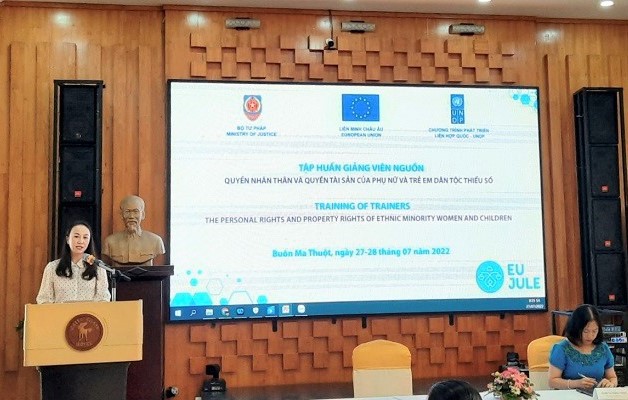 Trong khuôn khổ Dự án “Tăng cường pháp luật và tư pháp tại Việt Nam” (EU JULE) do Liên minh Châu Âu tài trợ, được thực hiện bởi UNDP và UNICEF trong 02 ngày 27-28/7/2022, Bộ Tư pháp đã tổ chức Hội nghị tập huấn “Quyền nhân thân và quyền tài sản của phụ nữ và trẻ em dân tộc thiểu số” tại thành phố Buôn Ma Thuột, tỉnh Đăk Lăk. Mục tiêu của khóa tập huấn nhằm cung cấp thông tin, kiến thức về quyền nhân thân và quyền tài sản cho cán bộ tư pháp hộ tịch, trợ giúp viên pháp lý, hòa giải viên, tuyên truyền viên pháp luật; đồng thời, hướng dẫn cách thức tổ chức, điều hành các lớp tập huấn, các buổi tuyên truyền, phổ biến pháp luật cho các tập huấn viên pháp luật.