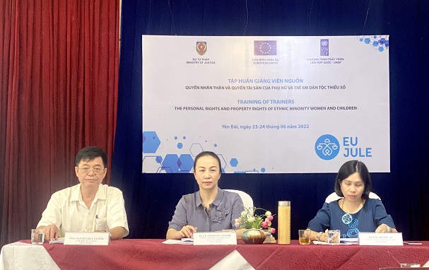 Trong khuôn khổ Dự án “Tăng cường pháp luật và tư pháp tại Việt Nam” (EU JULE) do Liên minh Châu Âu tài trợ, được thực hiện bởi UNDP và UNICEF trong 02 ngày 23-24/6/2022, Bộ Tư pháp tổ chức Hội nghị tập huấn “Quyền nhân thân và quyền tài sản của phụ nữ và trẻ em dân tộc thiểu số” tại thành phố Yên Bái. Mục tiêu của khóa tập huấn nhằm cung cấp thông tin, kiến thức về quyền nhân thân và quyền tài sản cho cán bộ tư pháp hộ tịch, trợ giúp viên pháp lý, hòa giải viên, tuyên truyền viên pháp luật. Đồng thời, hướng dẫn cách thức tổ chức, điều hành các lớp tập huấn, các buổi tuyên truyền, phổ biến pháp luật cho người dân, đặc biệt là phụ nữ và trẻ em dân tộc thiểu số.