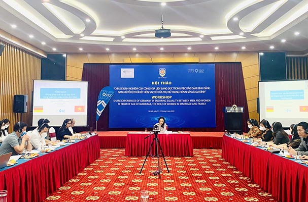 Trong khuôn khổ Chương trình hợp tác đối thoại Nhà nước pháp quyền giữa Bộ Tư pháp CHXHCN Việt Nam và Bộ Tư pháp và Bảo vệ người tiêu dùng Liên bang CHLB Đức, ngày 22-23/3/2022, Bộ Tư pháp phối hợp với Viện Hợp tác quốc tế Đức về Pháp luật tổ chức Hội thảo “Chia sẻ kinh nghiệm của Cộng hòa Liên bang Đức trong việc bảo đảm bình đẳng nam nữ về độ tuổi kết hôn, vai trò của phụ nữ trong hôn nhân và gia đình”, với mục tiêu giới thiệu, trao đổi về pháp luật hôn nhân và gia đình của Việt Nam và Đức, học hỏi kinh nghiệm của CHLB Đức, từ đó hướng đến hoàn thiện pháp luật hôn nhân & gia đình, đảm bảo tương thích với các cam kết quốc tế mà Việt Nam đã tham gia, như: Công ước quốc tế về các quyền dân sự và chính trị (ICCPR) và Công ước xóa bỏ mọi hình thức phân biệt đối xử với phụ nữ (CEDAW).