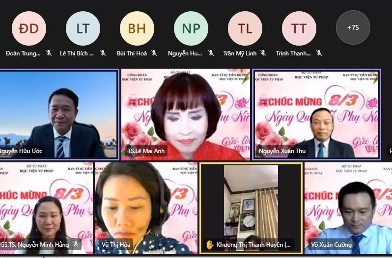 Chiều ngày 08/3, Ban chấp hành Công đoàn, Ban vì sự tiến bộ phụ nữ và Đoàn thanh niên Học viện Tư pháp phối hợp tổ chức buổi mitting trực tuyến và chúc mừng sinh nhật những viên chức, người lao động có sinh nhật trong quý I. Dự buổi mitting có đồng chí Khương Thị Thanh Huyền – Chủ tịch Công đoàn Bộ Tư pháp; đồng chí Nguyễn Xuân Thu – Bí thư Đảng ủy, Giám đốc Học viện Tư pháp; đồng chí Nguyễn Trường Thiệp – Phó giám đốc Học viện Tư pháp; đồng chí Trương Thế Côn – Phó giám đốc Học viện Tư pháp; đồng chí Nguyễn Minh Hằng – Phó giám đốc Học viện Tư pháp; đồng chí Vũ Thị Hòa – Trưởng Khoa Đào tạo Luật sư, Chủ tịch Công đoàn Học viện Tư pháp. Tại các điểm cầu cá nhân còn có toàn bộ viên chức, người lao động của Học viện Tư pháp.