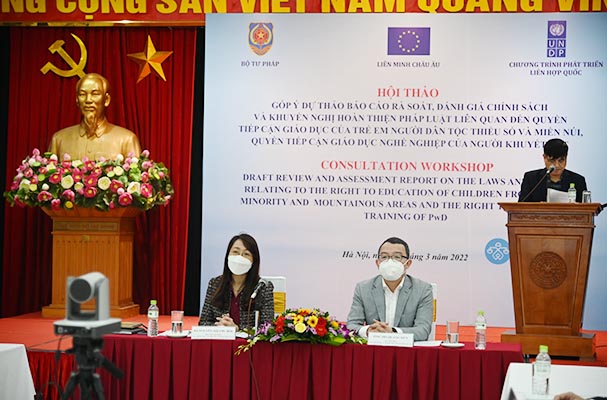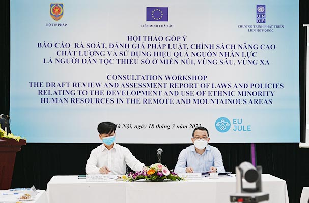 Sáng nay – 18/03, Bộ Tư pháp Việt Nam phối hợp với Liên minh Châu Âu (European Union) và Chương trình phát triển Liên Hợp quốc (UNDP) tổ chức Hội thảo góp ý Báo cáo rà soát, đánh giá pháp luật, chính sách và khuyến nghị hoàn thiện pháp luật liên quan đến nâng cao chất lượng và sử dụng hiệu quả nguồn nhân lực là người dân tộc thiểu số ở miền núi, vùng sâu, vùng xa, trọng tâm là lĩnh vực pháp luật và tư pháp.