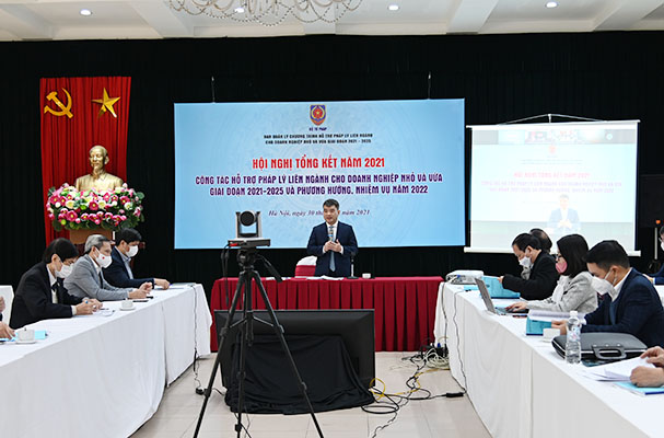 Sáng ngày 30/12, Ban Quản lý chương trình hỗ trợ pháp lý liên ngành (HTPLLN) cho doanh nghiệp nhỏ và vừa (DNNVV) giai đoạn 2021-2025 (Bộ Tư pháp) đã tổ chức Hội nghị tổng kết năm 2021“Công tác hỗ trợ pháp lý liên ngành cho doanh nghiệp nhỏ và vừa giai đoạn 2020-2025 và phương hướng, nhiệm vụ năm 2022” theo hình thức trực tiếp kết hợp trực tuyến. Vụ trưởng Vụ Pháp luật Dân sự - Kinh tế Nguyễn Thanh Tú, Phó Trưởng ban Ban Quản lý Chương trình hỗ trợ pháp lý liên ngành chủ trì Hội nghị. Tham dự Hội nghị còn có đại diện các Bộ, Ban, ngành, địa phương và doanh nghiệp.