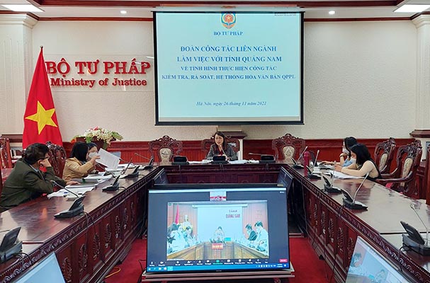 Chiều 26/11, Đoàn công tác liên ngành do bà Nguyễn Thị Thu Hòe, Phó Cục trưởng Cục Kiểm tra VBQPPL, Bộ Tư pháp làm Phó Trưởng đoàn đã chủ trì buổi làm việc trực tuyến với UBND tỉnh Quảng Nam về tình hình thực hiện công tác kiểm tra, rà soát, hệ thống hóa VBQPPL. Về phía tỉnh Quảng Nam có Phó Chủ tịch UBND tỉnh Trần Văn Tân và đại diện Lãnh đạo các Sở, ban, ngành của tỉnh.