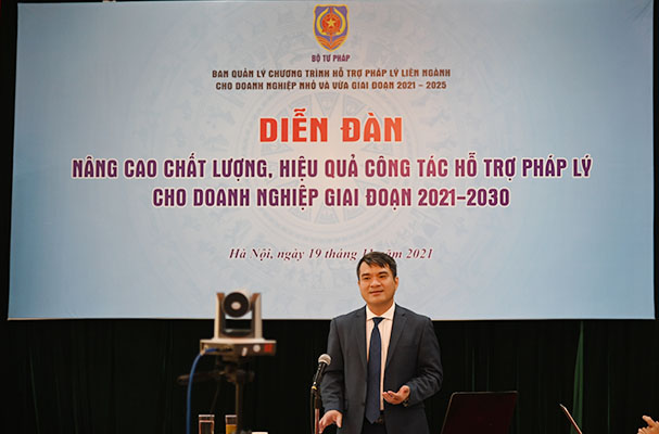 Sáng ngày 19/11, Bộ Tư pháp đã tổ chức Diễn đàn trực tuyến “Nâng cao chất lượng, hiệu quả công tác hỗ trợ pháp lý cho doanh nghiệp giai đoạn 2021-2030”. Vụ trưởng Vụ Pháp luật Dân sự - Kinh tế Nguyễn Thanh Tú, Phó Trưởng ban Quản lý Chương trình hỗ trợ pháp lý cho doanh nghiệp nhỏ và vừa giai đoạn 2021-2025 chủ trì Diễn đàn. Tham dự Diễn đàn còn có một số đại biểu dự họp trực tiếp và 82 đại biểu dự họp thông qua hình thức trực tuyến.