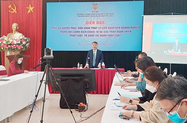 Chiều 23/11, Ban Quản lý chương trình hỗ trợ pháp lý liên ngành cho doanh nghiệp nhỏ và vừa giai đoạn 2021-2025 (Bộ Tư pháp) đã tổ chức Diễn đàn trực tuyến “Một số vướng mắc, khó khăn pháp lý liên quan đến doanh nghiệp trong bối cảnh dịch Covid-19 và giải pháp hoàn thiện pháp luật, tổ chức thi hành pháp luât” với sự chủ trì của Vụ trưởng Vụ Pháp luật Dân sự - Kinh tế Nguyễn Thanh Tú.