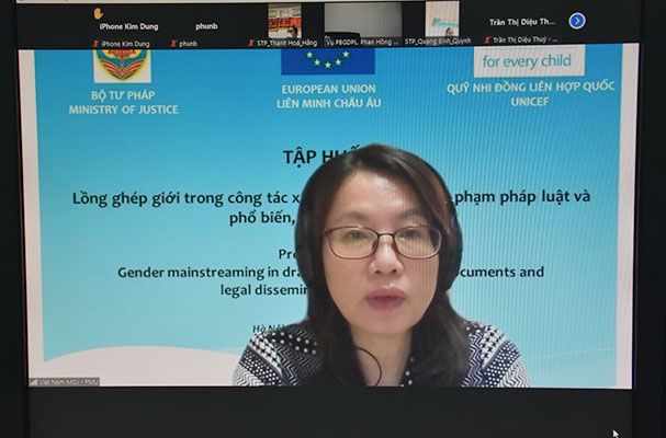 Thực hiện Chương trình công tác của Ban Vì sự tiến bộ Phụ nữ (VSTBPN) ngành Tư pháp, được sự đồng ý của Lãnh đạo Bộ Tư pháp, trong khuôn khổ dự án Tăng cường pháp luật và tư pháp tại tại Việt Nam (EUJULE) năm 2021, chiều nay (14/9), Ban VSTBPN ngành Tư pháp tổ chức Tập huấn thử nghiệm “Tài liệu hướng dẫn lồng ghép vấn đề giới trong công tác xây dựng văn bản quy phạm pháp luật và phổ biến, giáo dục pháp luật dành cho các cơ quan địa phương”. Đồng chí Phan Thị Hồng Hà, Q.Vụ trưởng Vụ Tổ chức cán bộ, Phó Trưởng ban VSTBPN ngành Tư pháp chủ trì Hội nghị.