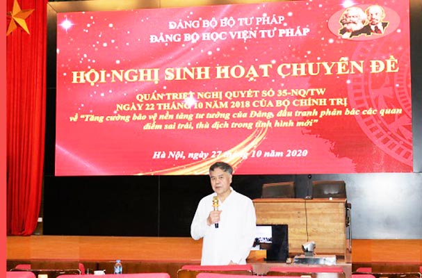 Sáng 28/10, Đảng bộ Học viện Tư pháp đã tổ chức Hội nghị sinh hoạt chuyên đề với chủ đề quán triệt Nghị quyết số 35-NQ/TW ngày 22/10/2018 của Bộ Chính trị khóa XII về “Tăng cường bảo vệ nền tảng tư tưởng của Đảng, đấu tranh phản bác các quan điểm sai trái, thù địch trong tình hình mới” cho công chức, viên chức, người lao động của Học viện Tư pháp. Đảng ủy Học viện Tư pháp cũng mời đảng viên Chi bộ Tạp chí dân chủ Pháp luật và Trung tâm Lý lịch tư pháp quốc gia; học viên Lớp đào tạo nghiệp vụ thi hành án khóa 20 tại Hà Nội, thành phố Hồ Chí Minh cùng tham dự Hội nghị.