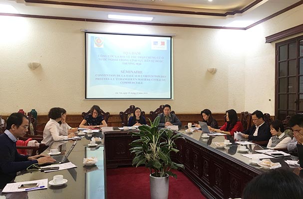 Vừa qua, tại trụ sở Bộ Tư pháp, Vụ Pháp luật quốc tế đã tổ chức tọa đàm chia sẻ kinh nghiệm của Cộng hòa Pháp trong thực thi Công ước La Hay năm 1970 về thu thập chứng cứ ở nước ngoài trong lĩnh vực dân sự hoặc thương mại (Tọa đàm). Đây là hoạt động triển khai Chương trình Hợp tác giai đoạn 2018-2019 giữa Bộ Tư pháp Việt Nam và Bộ Tư pháp Cộng hòa Pháp. Tọa đàm còn nhằm mục đích thu thập thông tin, kinh nghiệm quốc tế phục vụ cho nhiệm vụ nghiên cứu gia nhập Công ước La Hay năm 1970 về thu thập chứng cứ ở nước ngoài trong lĩnh vực dân sự hoặc thương mại của Việt Nam được Thủ tướng Chính phủ giao cho Bộ Tư pháp thực hiện.