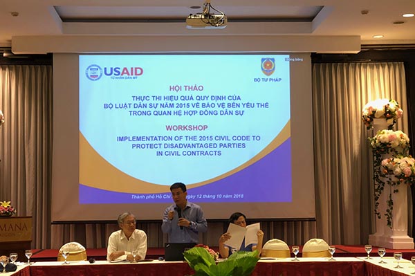 Thực tiễn hiện nay ngày càng đặt ra vấn đề bảo vệ người yếu thế trong các quan hệ tư nói chung, quan hệ hợp đồng nói riêng. Vì vậy trong khuôn khổ hợp tác giữa Bộ Tư pháp và Dự án Quản trị Nhà nước nhằm tăng trưởng toàn diện (GIG) của Cơ quan Phát triển Quốc tế Hoa Kỳ (USAID), tiếp nối Hội thảo vào tháng 5/2018 với nội dung tập trung vào pháp luật bảo vệ người yếu thế do năng lực hành vi dân sự và do định kiến xã hội, ngày 12/10/2018, tại Thành phố Hồ Chí Minh, Vụ Pháp luật dân sự - kinh tế đã tổ chức Hội thảo “Thực thi hiệu quả quy định của Bộ luật dân sự năm 2015 về bảo vệ người yếu thế trong quan hệ hợp đồng” với nội dung tập trung vào nhận diện người yếu thế trong hợp đồng thương mại, kinh doanh bất động sản, dịch vụ...