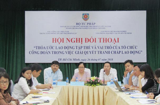 Ngày 26/7/2018, Trung tâm Thông tin, hỗ trợ pháp luật Cục Công tác phía Nam Bộ Tư Pháp (Cục CTPN) và Văn phòng đại diện Câu lạc bộ pháp chế doanh nghiệp tại thành phố Hồ Chí Minh đã tổ chức hội nghị đối thoại với doanh nghiệp “Thỏa ước lao động tập thể và vai trò của tổ chức công đoàn trong việc giải quyết tranh chấp lao động”. Hội nghị được thực hiện với sự hỗ trợ kinh phí từ Chương trình hỗ trợ pháp lý liên ngành dành cho doanh nghiệp giai đoạn 2015-2020 (Chương trình 585), Bộ Tư pháp.