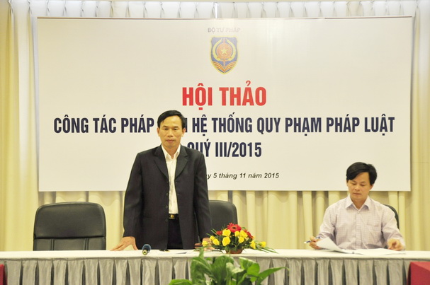 Chiều 05/11, Cục Kiểm tra văn bản quy phạm pháp luật, Bộ Tư pháp đã tổ chức Hội thảo định kỳ công tác pháp điển hệ thống quy phạm pháp luật (QPPL) quý III năm 2015 cho các cán bộ làm công tác pháp điển tại các Bộ, ngành ở Trung ương. Cục trưởng Cục Kiểm tra văn bản QPPL Đồng Ngọc Ba chủ trì Hội thảo.