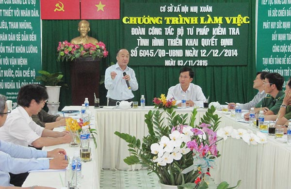 Thực hiện Quyết định số 1066/QĐ-BTP của Bộ trưởng Bộ Tư pháp về việc thành lập Đoàn kiểm tra liên ngành tình hình triển khai thực hiện quy định của Nghị quyết số 77/2014/QH13 ngày 10/11/2014 của Quốc hội về việc “tiếp nhận để quản lý, cắt cơn, giải độc, tư vấn tâm lý cho người nghiện ma túy không có nơi cư trú ổn định trong thời gian lập hồ sơ để TAND xem xét, quyết định đưa vào cơ sở cai nghiện bắt buộc”, trong hai ngày 02 và 03/11/2015, Đoàn kiểm tra liên ngành (Đoàn kiểm tra) do Bộ Tư pháp đã chủ trì đã kiểm tra về tình hình triển khai thực hiện Nghị quyết số 77/2014/QH13 về vấn đề nêu trên tại Sở Lao động Thương binh và xã hội (Sở LĐ-TB&XH) thành phố Chí Minh, Cơ sở xã hội Thanh thiếu niên 2 và Cơ sở xã hội Nhị Xuân. Đoàn kiểm tra do đồng chí Đặng Thanh Sơn, Cục trưởng Cục Quản lý xử lý vi phạm hành chính và theo dõi thi hành pháp luật, Bộ Tư pháp làm Trưởng đoàn.
