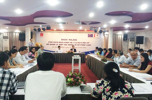 Thực hiện Kế hoạch phổ biến Nghị định số 113/2014/NĐ-CP ngày 26/11/2014 của Chính phủ về quản lý hợp tác quốc tế về pháp luật, trong khuôn khổ Chương trình Đối tác Tư pháp do EU, Thụy Điển và Đan Mạch tài trợ, Bộ Tư pháp tiếp tục tổ chức Hội nghị phổ biến Nghị định số 113/2014/NĐ-CP về quản lý hợp tác quốc tế và lấy ý kiến góp ý Dự thảo Thông tư quy định chi tiết và hướng dẫn thực hiện Nghị định số 113/2014/NĐ-CP trong 2 ngày 23 và 24 tháng 3 năm 2015 tại Thành phố Hồ Chí Minh.