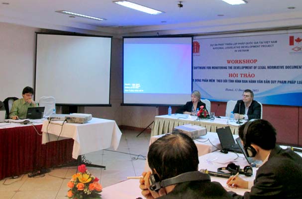 Trong khuôn khổ hoạt động của Dự án “Phát triển lập pháp quốc gia tại Việt Nam” do Chính phủ Canada tài trợ, Bộ Tư pháp (Vụ Các vấn đề chung về xây dựng pháp luật) đã tổ chức hội thảo quốc tế “Xây dựng phần mềm theo dõi tình hình ban hành văn bản quy phạm pháp luật” vào ngày 12/12/2013 nhằm giới thiệu về phần mềm theo dõi tình hình ban hành văn bản quy phạm pháp luật đang được hỗ trợ xây dựng từ Dự án “Phát triển lập pháp quốc gia tại Việt Nam” và ghi nhận những ý kiến đóng góp của các chuyên gia, đại diện các Bộ, ngành cho việc xây dựng phần mềm này. Hội thảo được diễn ra tại Khách sạn Sài Gòn, số 80 Lý Thường Kiệt, Hà Nội.