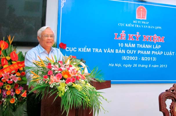 Chiều ngày 26/8, Cục Kiểm tra văn bản quy phạm pháp luật đã tổ chức Lễ kỷ niệm 10 năm thành lập Cục (8/2003 – 8/2013). Tham dự buổi Lễ có đồng chí Uông Chu Lưu, Phó Chủ tịch Quốc hội, Nguyên Bộ trưởng Bộ Tư pháp, đồng chí Hà Hùng Cường, Bí thư Ban Cán sự, Bộ trưởng Bộ Tư pháp, đồng chí Đinh Trung Tụng, Thứ trưởng Bộ Tư pháp, các đồng chí Nguyên Lãnh đạo Bộ: Nguyễn Đình Lộc, Phạm Quý Tỵ và đại diện Lãnh đạo của 20 Tổ chức pháp chế các Bộ, ngành, Sở Tư pháp một số địa phương và đại diện lãnh đạo một số đơn vị thuộc Bộ cùng đông đảo công chức, viên chức đã và đang công tác tại Cục.