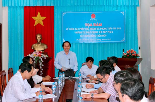Thực hiện Kế hoạch số 317/KH-CCTPN ngày 29/8/2013, sáng ngày 12/9/2013, Cục Công tác phía Nam đã tổ chức Tọa đàm về công tác pháp chế Ngành và phong trào thi đua “Ngành Tư pháp chung sức góp phần xây dựng nông thôn mới”. Tọa đàm do đồng chí Lê Tiến Châu - Cục trưởng Cục công tác phía Nam và đồng chí Nguyễn Bá Yên - Vụ trưởng vụ Thi đua – Khen thưởng đồng chủ trì, với sự tham dự của trên 30 đại biểu đến từ 13 Sở Tư pháp, 2 Cục Thi hành án dân sự (thành phố Hồ Chí Minh và Đồng Nai) và đại diện pháp chế của một số sở, ngành tại thành phố Hồ Chí Minh.