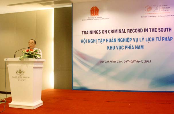 Trong khuôn khổ Chương trình hợp tác “Đối thoại Nhà nước Pháp quyền giữa Bộ Tư pháp Cộng hòa Xã hội chủ nghĩa Việt Nam và Bộ Tư pháp Cộng hòa Liên bang Đức” giai đoạn 2012-2014, trong 02 ngày, 04 và 05 tháng 4 năm 2013, Trung tâm Lý lịch tư pháp quốc gia, Bộ Tư pháp phối hợp với Viện Konrad Adenauer Stiftung (KAS) tổ chức Hội nghị tập huấn nghiệp vụ lý lịch tư pháp khu vực phía Nam tại thành phố Hồ Chí Minh (gồm học viên của 32 tỉnh, thành phía Nam, từ Đà Nẵng trở vào).