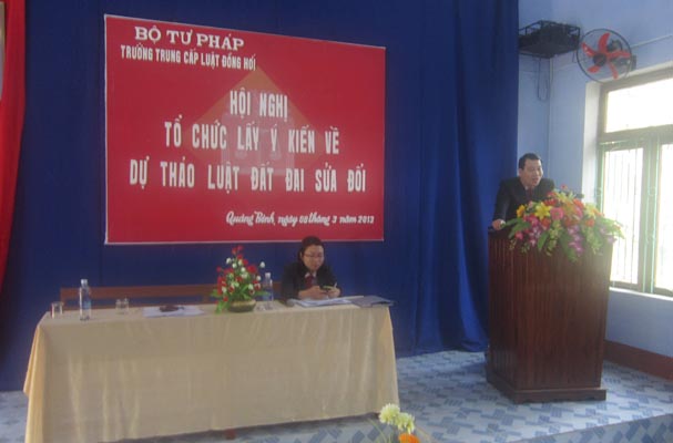 Thực hiện ý kiến chỉ đạo của Thủ tướng Chính phủ và Bộ Tư pháp về việc tổ chức lấy ý kiến Dự thảo Luật Đất đai (sửa đổi), ngày 14/3/2013, Trường Trung cấp Luật Vị Thanh đã tổ chức Hội nghị lấy ý kiến Dự thảo Luật Đất đai (sửa đổi) dưới sự chủ trì của ThS. Nguyễn Văn Phụng - Phó Hiệu trưởng cùng sự góp mặt của toàn thể cán bộ, viên chức nhà trường.