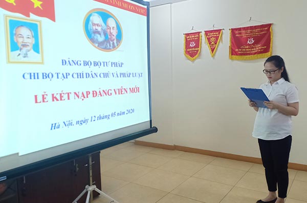Chi bộ Tạp chí DC&PL tổ chức kết nạp Đảng viên mới và trao Quyết định công nhận Đảng viên chính thứcSinh thời Chủ tịch Hồ Chí Minh đã khẳng định: “Vấn đề phát triển Đảng là vấn đề quan trọng trong xây dựng Đảng. Đảng phải có một số lượng Đảng viên nhất định mới hình thành nên tổ chức Đảng. Sự nghiệp lãnh đạo cách mạng của Đảng là sự nghiệp vĩ đại lâu dài, phải do nhiều thế hệ chiến sĩ cộng sản tham gia gánh vác. Năng lực lãnh đạo và sức chiến đấu chỉ có thể có trên cơ sở số lượng, chất lượng đội ngũ Đảng viên tương ứng. Do đó, Đảng phải thường xuyên làm tốt công tác phát triển Đảng”. Với ý nghĩa đó, sáng ngày 12/05/2020, Chi bộ Tạp chí Dân chủ và Pháp luật đã tổ chức Lễ kết nạp Đảng viên mới cho quần chúng ưu tú Phạm Thu Hằng - Biên tập viên.Buổi Lễ kết nạp được diễn ra trong không khí trang nghiêm, đúng trình tự, thủ tục. Thay mặt Chi bộ Tạp chí, đồng chí Vũ Hoài Nam - Bí thư Chi bộ đã công bố và trao Quyết định kết nạp Đảng viên cho đồng chí Phạm Thu Hằng, đồng chí Bí thư Chi bộ cũng căn dặn đồng chí Đảng viên mới tích cực rèn luyện, nâng cao năng lực chuyên môn, phẩm chất chính trị, đạo đức cách mạng, thực hiện đúng trách nhiệm và nghĩa vụ của người Đảng viên Đảng Cộng sản Việt Nam, đồng thời, phổ biến nhiệm vụ, quyền hạn của Đảng viên mới và phân công Đảng viên chính thức giúp đỡ đồng chí Đảng viên mới sớm trở thành Đảng viên chính thức đúng thời hạn.