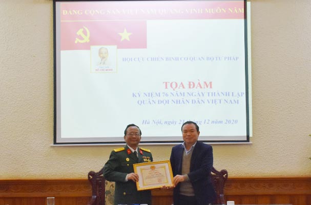 Đây là nhấn mạnh của Thứ trưởng Bộ Tư pháp Nguyễn Thanh Tịnh tại Tọa đàm Kỷ niệm 76 năm Ngày thành lập Quân đội nhân dân Việt Nam của Hội Cựu chiến binh Bộ Tư pháp diễn ra vào chiều ngày 21/12. Tham dự Tọa đàm còn có đồng chí Nguyễn Kim Tinh Phó Bí thư thường trực Đảng ủy Bộ Tư pháp và đồng chí Nguyễn Quốc Huy, Chủ tịch Hội Cựu Chiến binh cơ quan Bộ Tư pháp.