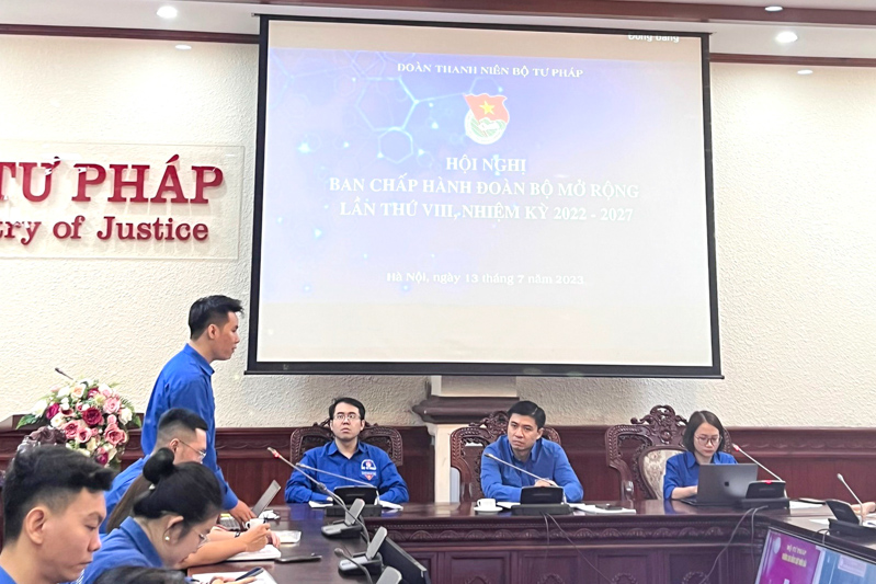 Tuổi trẻ Bộ Tư pháp: Hoàn thành các chỉ tiêu 6 tháng đầu năm 2023Thực hiện chương trình công tác Đoàn và phong trào thanh niên năm 2023; Điều lệ Đoàn TNCS Hồ Chí Minh khóa XI và Quy chế làm việc của Ban Chấp hành Đoàn Bộ Tư pháp khóa VII (nhiệm kỳ 2022 - 2027), chiều ngày 13/7/2023 đã diễn ra Hội nghị lần thứ VIII Ban Chấp hành Đoàn Bộ Tư pháp (mở rộng). Tham dự Hội nghị có các đồng chí Ủy viên Ban Thường vụ, Ủy viên Ban Chấp hành Đoàn Bộ, Uỷ viên Uỷ ban kiểm tra Đoàn Bộ, Bí thư, Phó Bí thư, Uỷ viên Ban Chấp hành các Chi đoàn, Đoàn cơ sở trực thuộc. Đồng chí Trịnh Xuân Tùng, Ủy viên Ban Chấp hành Đoàn Khối các cơ quan Trung ương, Bí thư Đoàn Bộ chủ trì Hội nghị.Hội nghị đã được nghe Văn phòng Đoàn Bộ, trình bày (i) Dự thảo báo cáo kết quả công tác Đoàn và phong trào thanh niên 6 tháng đầu năm; phương hướng nhiệm vụ 06 tháng cuối năm 2023; (ii) Báo cáo kết quả thực hiện Thông báo kết luận cuộc họp Ban Chấp hành Đoàn Bộ Tư pháp lần thứ VII; (iii) Kết quả bước đầu triển khai các hoạt động trong tháng 7 và dự kiến các hoạt động trong tháng 8 nhân kỷ niệm 78 năm Ngày truyền thống ngành Tư pháp Việt Nam (28/8/1945 - 28/8/2023)…