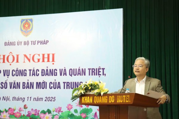 Thực hiện Kế hoạch số 09-KH/ĐU ngày 04/11/2025, Đảng ủy Bộ Tư pháp tổ chức Hội nghị tập huấn nghiệp vụ công tác Đảng và quán triệt, triển khai một số văn bản mới của Trung ương năm 2025 nhằm trang bị cho các đồng chí cấp ủy, cán bộ làm công tác Đảng của Đảng ủy Bộ các kiến thức cơ bản, những điểm mới nổi bật của các văn bản; đồng thời, tăng cường trao đổi, thảo luận để mỗi đồng chí khi trở về đơn vị sẽ chủ động tổ chức tốt việc quán triệt và đưa vào thực tiễn công tác, lãnh đạo, chỉ đạo, kiểm tra, giám sát tại đơn vị.