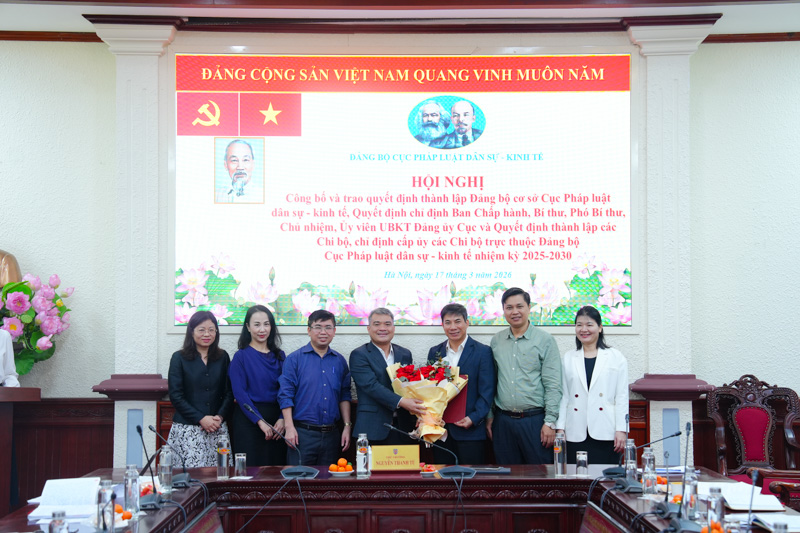 Ngày 17/3, Đảng bộ Cục Pháp luật dân sự - kinh tế đã tổ chức Hội nghị công bố và trao Quyết định thành lập Đảng bộ cơ sở Cục Pháp luật dân sự - kinh tế, Quyết định chỉ định Ban Chấp hành, Bí thư, Phó Bí thư, Chủ nhiệm, Ủy viên Ủy ban Kiểm tra Đảng ủy Cục và Quyết định thành lập các Chi bộ, chỉ định cấp ủy các Chi bộ trực thuộc Đảng bộ Cục Pháp luật dân sự - kinh tế nhiệm kỳ 2025 - 2030. Ủy viên Ban Thường vụ Đảng ủy, Thứ trưởng Bộ Tư pháp Nguyễn Thanh Tú chủ trì Hội nghị.