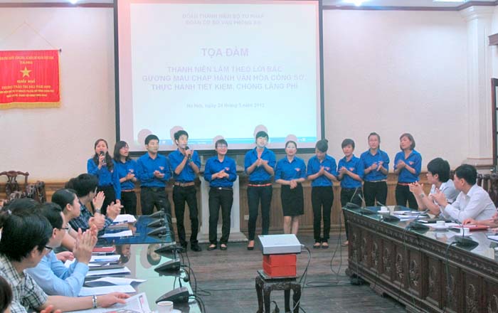 Hưởng ứng phong trào thi đua “Cán bộ Tư pháp tiếp tục đẩy mạnh học tập và làm theo tấm gương đạo đức Hồ Chí Minh” do Đảng ủy Bộ Tư pháp phát động tại Lễ kỷ niệm 122 năm Ngày sinh của Chủ tịch Hồ Chí Minh, ngày 24/5/2012, Đoàn cơ sở Văn phòng Bộ tổ chức buổi Tọa đàm với chủ đề “Thanh niên làm theo lời Bác, gương mẫu chấp hành văn hóa công sở, thực hành tiết kiệm, chống lãng phí”.