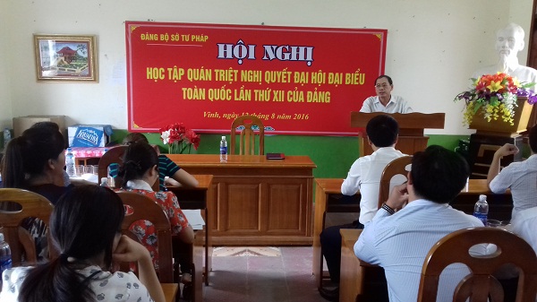 Thực hiện Kế hoạch của Tỉnh ủy và Đảng ủy khối các cơ quan tỉnh Ninh Bình về tổ chức học tập, quán triệt Nghị quyết Đại hội lần thứ XII của Đảng, sáng ngày 12/8, Đảng ủy Sở Tư pháp tỉnh Ninh Bình tổ chức Hội nghị học tập, quán triệt Nghị quyết Đại hội lần thứ XII của Đảng tới toàn thể các đồng chí đảng viên, công chức, viên chức và người lao động trong cơ quan. Đồng chí Nguyễn Hùng Tiến – Bí thư Đảng ủy, Giám đốc Sở Tư pháp dự và chỉ đạo hội nghị.