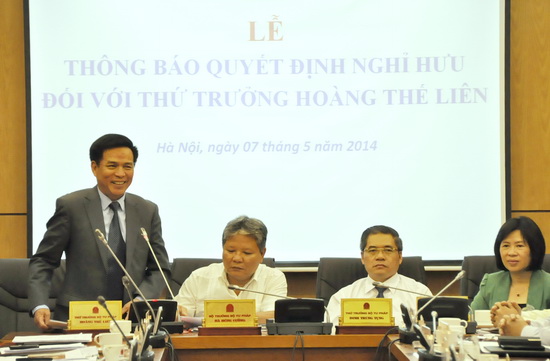 Phát biểu tại buổi lễ, Bộ trưởng cảm ơn và ghi nhận những cống hiến của Thứ trưởng thời gian qua và mong rằng Thứ trưởng Hoàng Thế Liên vẫn tiếp tục có sự quan tâm, cố vấn và có nhiều ý kiến sâu sắc cho công tác tư pháp trong thời gian tới.