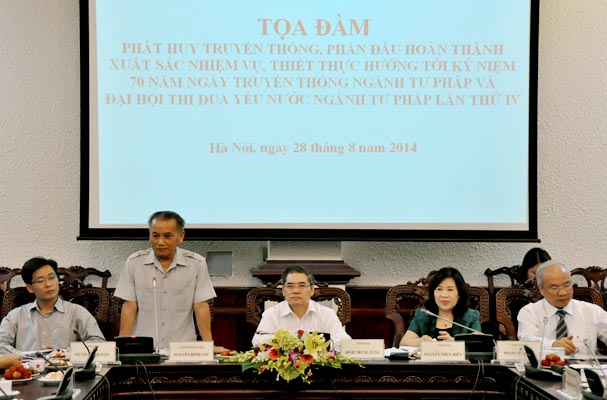 Chiều ngày 28/8, Bộ Tư pháp đã tổ chức Tọa đàm 69 năm Ngày truyền thống Ngành Tư pháp với chủ đề “Phát huy truyền thống phấn đấu hoàn thành xuất sắc nhiệm vụ, thiết thực hướng tới Kỷ niệm 70 năm Ngày truyền thống Ngành Tư pháp và Đại hội thi đua yêu nước Ngành Tư pháp lần thứ IV”. Buổi tọa đàm có sự tham dự của đại diện các thế hệ lãnh đạo, các thế hệ cán bộ, công chức, viên chức đã và đang công tác tại Bộ Tư pháp. Đến dự buổi Tọa đàm có nguyên Bộ trưởng Nguyễn Đình Lộc, Thứ trưởng Đinh Trung Tụng, Thứ trưởng Nguyễn Thúy Hiền, Thứ trưởng Phan Chí Hiếu, Thứ trưởng Nguyễn Khánh Ngọc, nguyên Thứ trưởng Phạm Qúy Tỵ, nguyên Thứ trưởng Hoàng Thế Liên.
