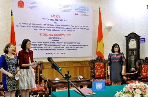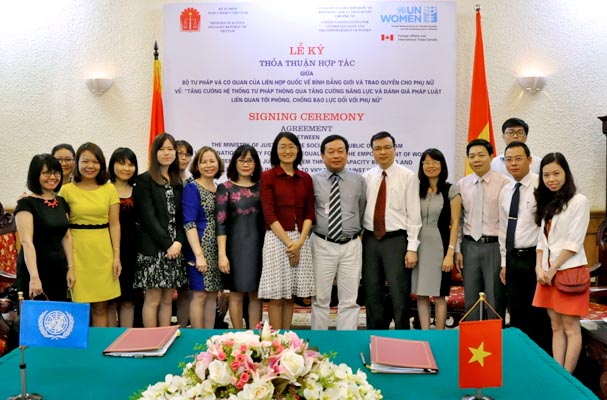 Bà Đặng Hoàng Oanh, Vụ trưởng Vụ Hợp tác quốc tế, theo sự ủy quyền của Bộ trưởng Bộ Tư pháp và bà Shoko Ishikawa, Đại diện UN Women tại Việt Nam, thay mặt hai tổ chức đã chính thức ký kết Thư thỏa thuận này. Tham dự Lễ ký kết có đại diện một số đơn vị thuộc Bộ Tư pháp, bao gồm Vụ Pháp luật Hình sự - Hành chính, Học viện Tư pháp – là hai đơn vị trực tiếp thực hiện Dự án và các đơn vị thuộc Bộ có liên quan trong quá trình thực hiện dự án này như: Vụ Các vấn đề chung về xây dựng pháp luật, Vụ Pháp luật quốc tế, Vụ Tổ chức cán bộ, Văn phòng Bộ, Vụ Hợp tác quốc tế    Cơ quan của LHQ về bình đẳng giới và trao quyền cho phụ nữ.